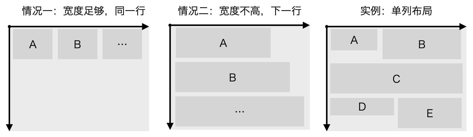 从代码层面看,它对你传入的列表项进行for循环遍历,并通过 _checkBounds方法来判断。如果当前遍历的列表项宽度和当前一列已有列表项的宽度之和,不超过屏幕宽度,也就是itemX + itemDim.width <= this._window.width,那么就跳过 while 循环,直接使用同一行前几个列表项的宽度之和startX += itemDim.width ,作为当前列表项的 x(startX) 坐标。也就是情况一:宽度足够,放到同一行。