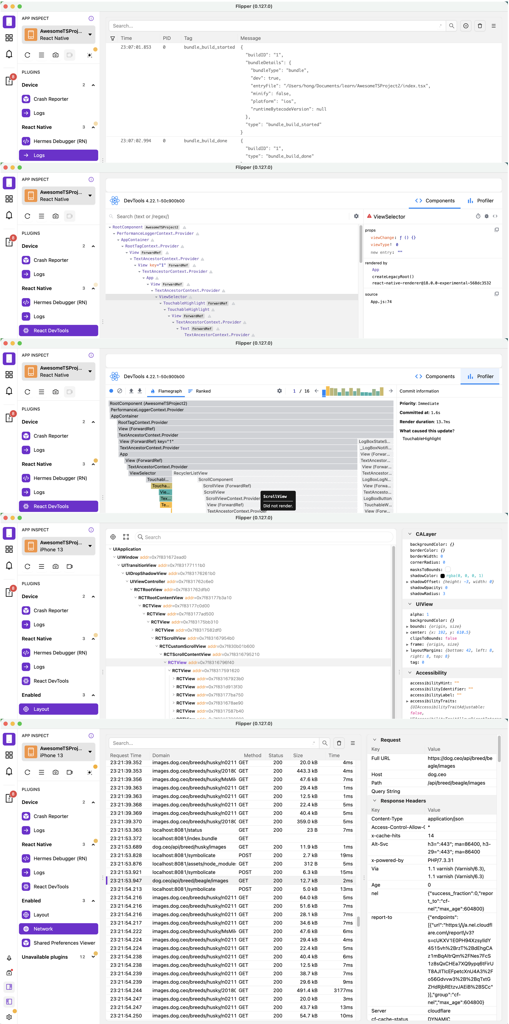 这张长截图显示了 Flipper 的功能,从上到下依次是打印日志 Logs、组件树 Components、性能火焰图 Profiler、宿主组件树和布局 Layout、网络请求 Network。它还有一个功能是支持 Hermes 引擎 Debugger,它和浏览器的 Debugger 类似,这里我没有进行截图了。