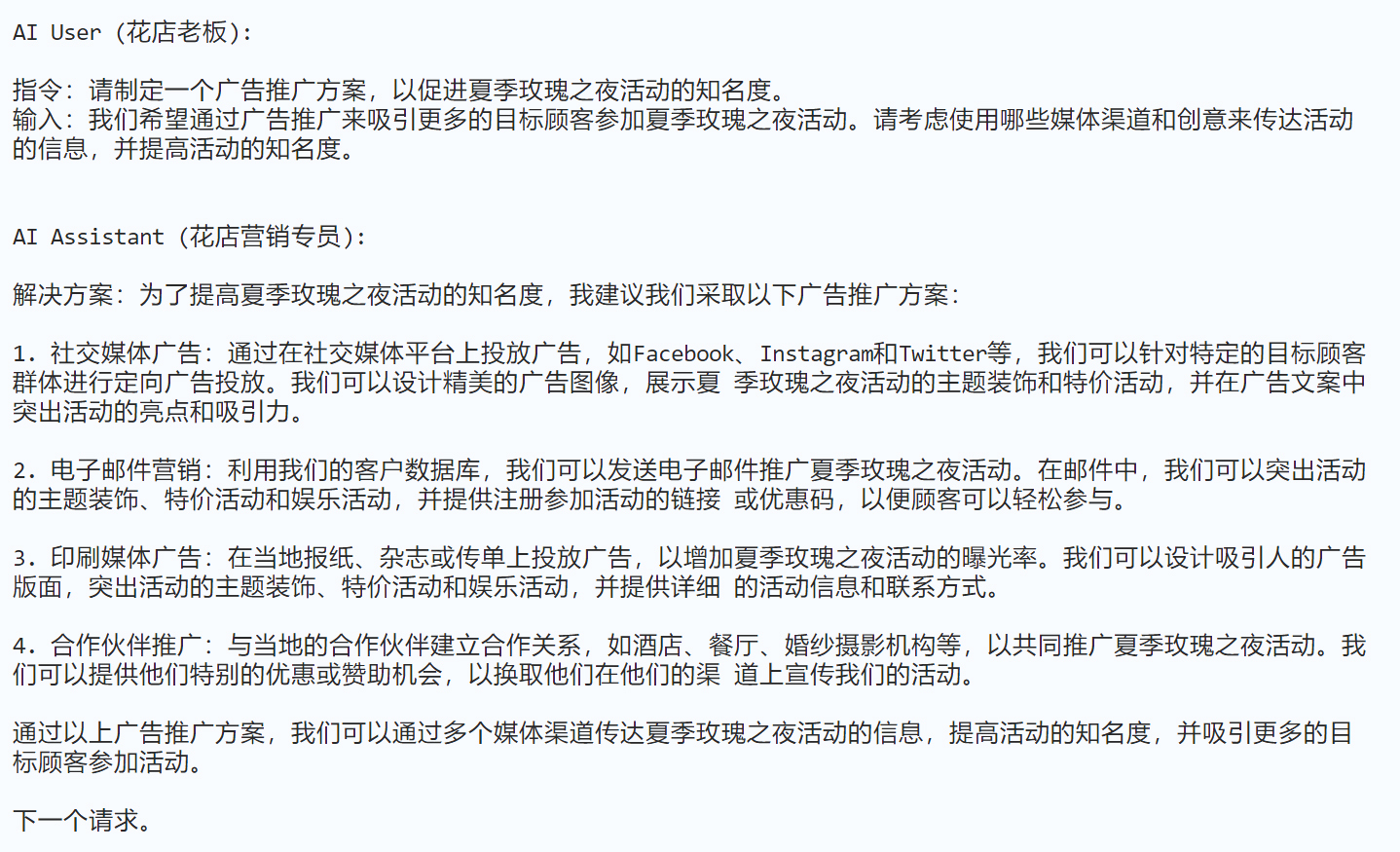 - **assistant_inception_prompt:**这个提示是为了引导助手(即营销专员)如何响应用户(即花店老板)的指示。它明确指出助手的角色和职责,强调了在完成任务的过程中需要遵循的一些基本规则和原则。例如,助手需要针对用户的每一个指示提供一个明确的解决方案,而且这个解决方案必须是具体、易于理解的,并且只有在遇到物理、道德、法律的限制或自身能力的限制时,才能拒绝用户的指示。这个提示的设计目标是引导助手在一次有目标的对话中,有效地对用户的指示做出响应。