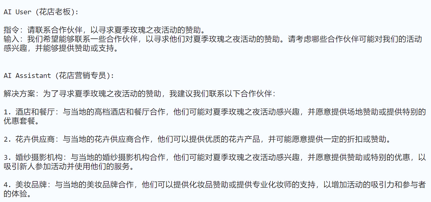 assistant_role_name = "花店营销专员":这是定义助手的角色。在此设定中,助手被视为一名花店营销专员,主要职责是为花店老板(即用户)提供关于营销活动的建议和策略。user_role_name = "花店老板":这是定义用户的角色。用户在这里是花店的老板,他们可能会向营销专员(即助手)提出关于花店推广活动的需求或询问,然后由营销专员来答复和提供建议。