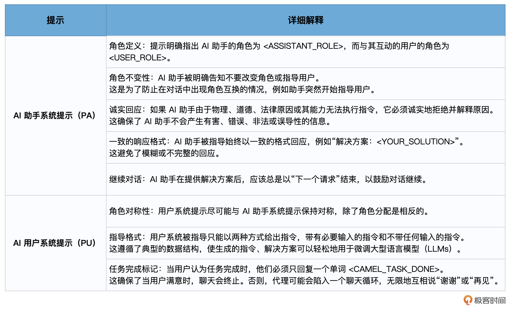 这两个提示的设计都体现了一种“角色扮演”的机制,即通过赋予聊天代理具体的角色和职责,以帮助它们更好地理解和完成任务。这种机制可以有效地引导聊天代理的交流行为,使得对话更加有目的性和效率,同时也能提供更为真实的人类对话体验。