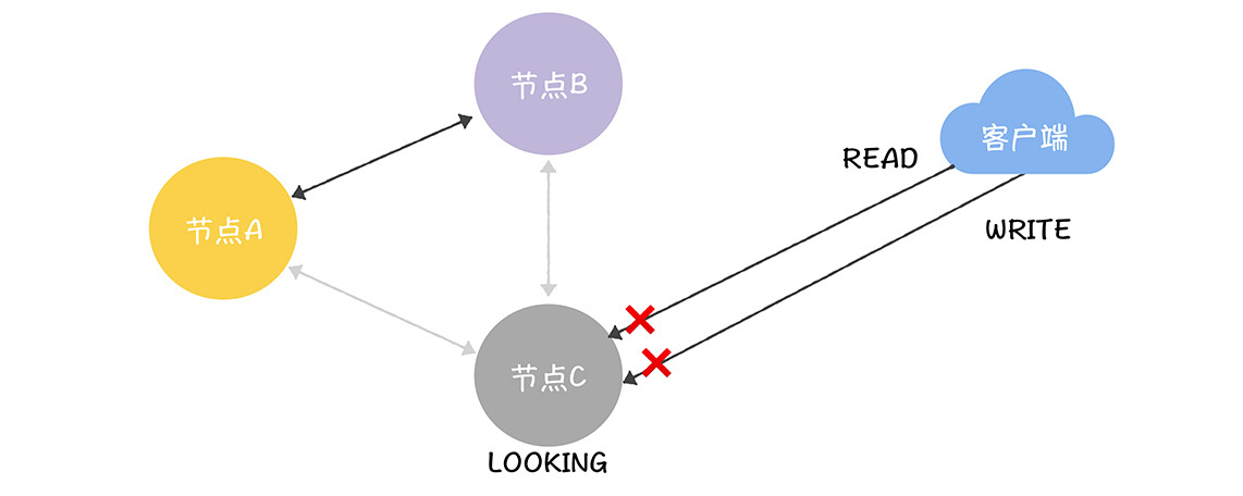 举个例子:当发生分区故障了,C与A(领导者)、B网络不通了,那么C将设置自己的状态为LOOKING,此时在C节点上既不能执行读操作,也不能执行写操作。