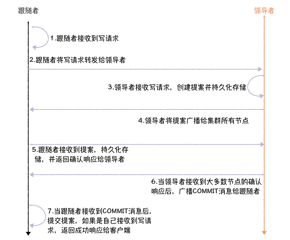这样,ZooKeeper就完成了写请求的处理。你要特别注意一下,在分布式系统中,消息或者核心信息的持久化存储很关键,也很重要,因为这是保证集群能稳定运行的关键。