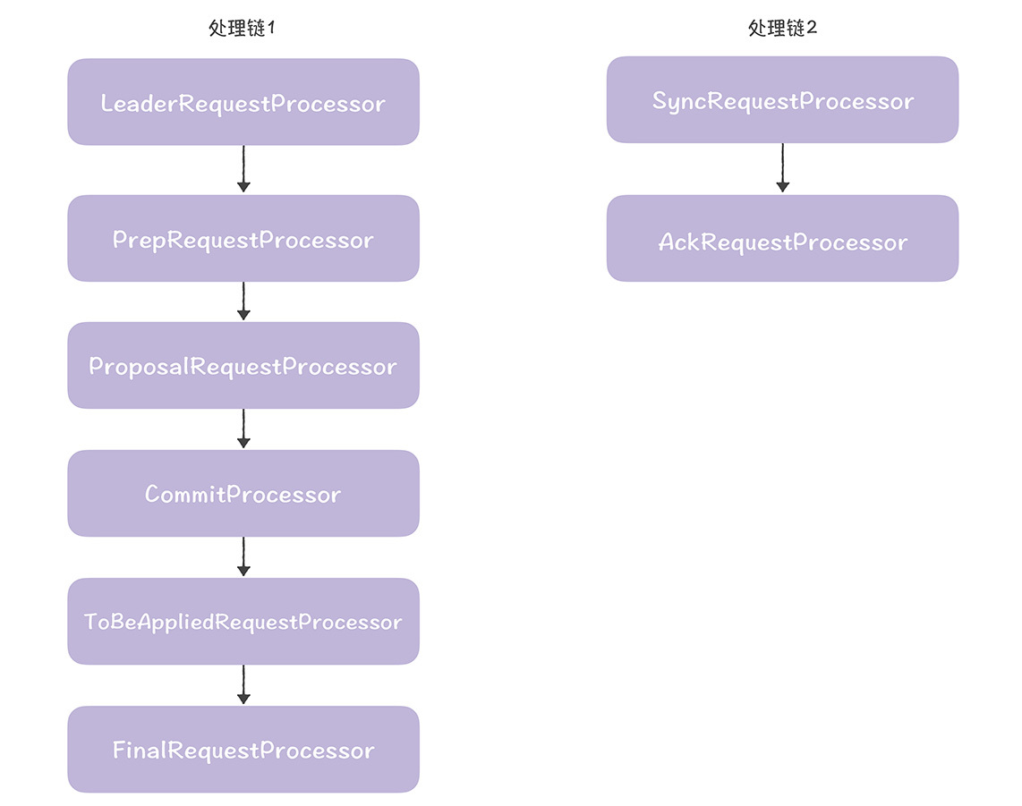 其中,处理链1是核心处理链,最终实现了写请求处理(创建提案、广播提案、提交提案)和读请求对应的数据响应。处理链2实现了提案持久化存储,并返回确认响应给领导者自己。