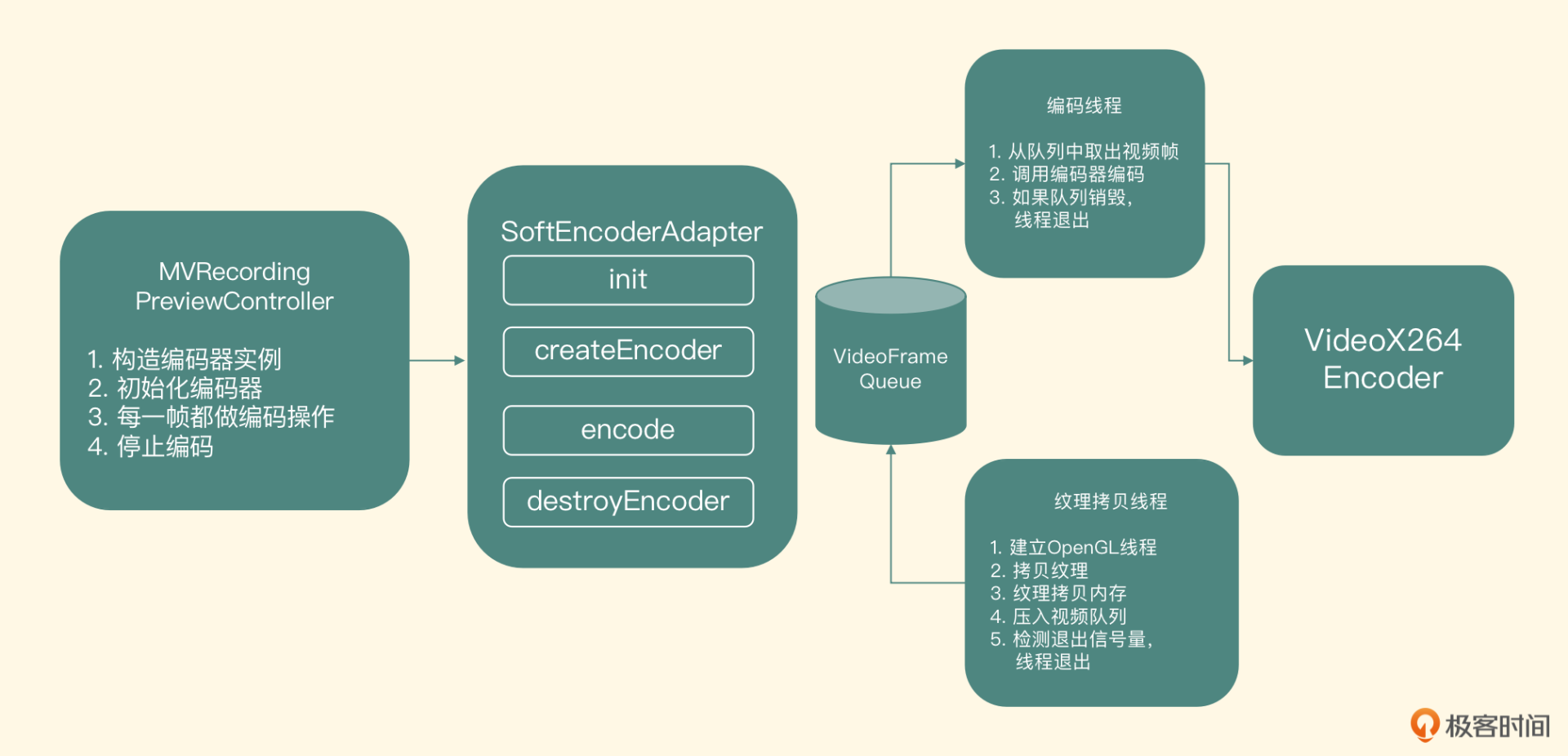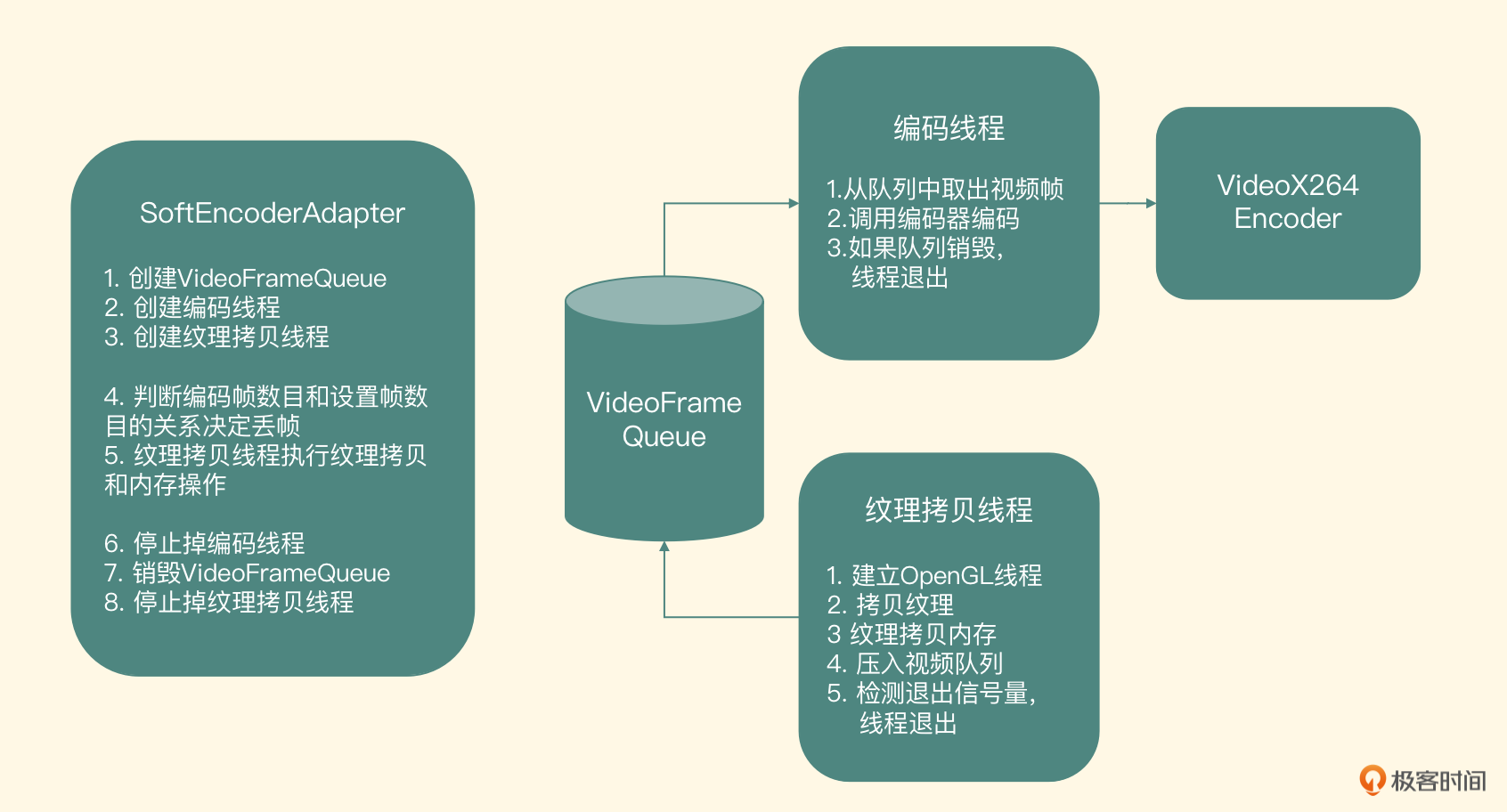 图里左边的第1点到第3点代表了createEncoder方法的内部实现,分别创建出了存储视频帧的队列VideoFrameQueue、编码线程和纹理拷贝线程。这三个对象的职责一目了然,接下来我们主要来看一下这三个对象内部是怎么实现的。