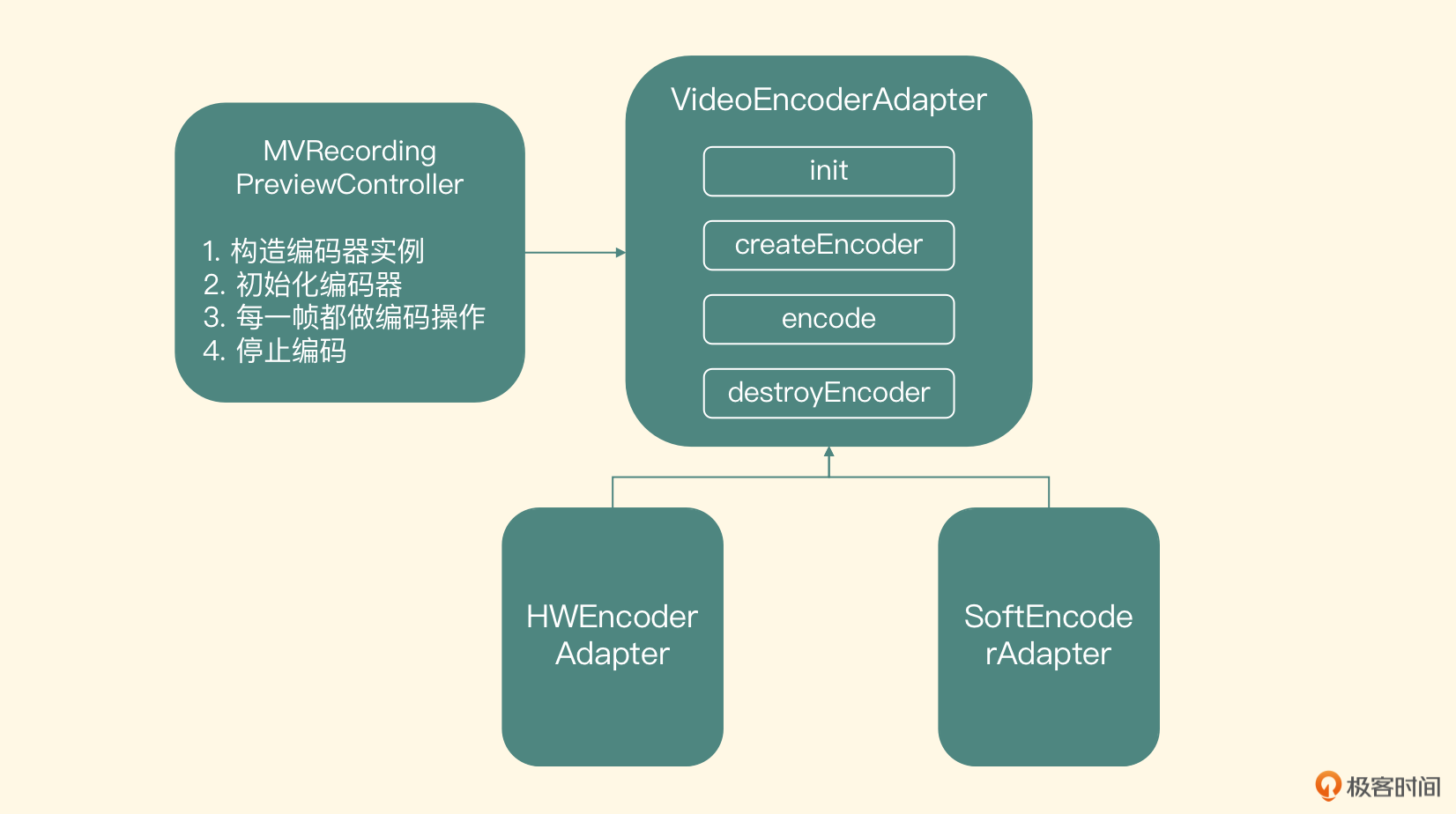 - 我们通过分析预览和编码场景引出了编码适配器的架构,主要实现了3个方法:初始化和创建编码器的接口、编码接口和销毁接口。