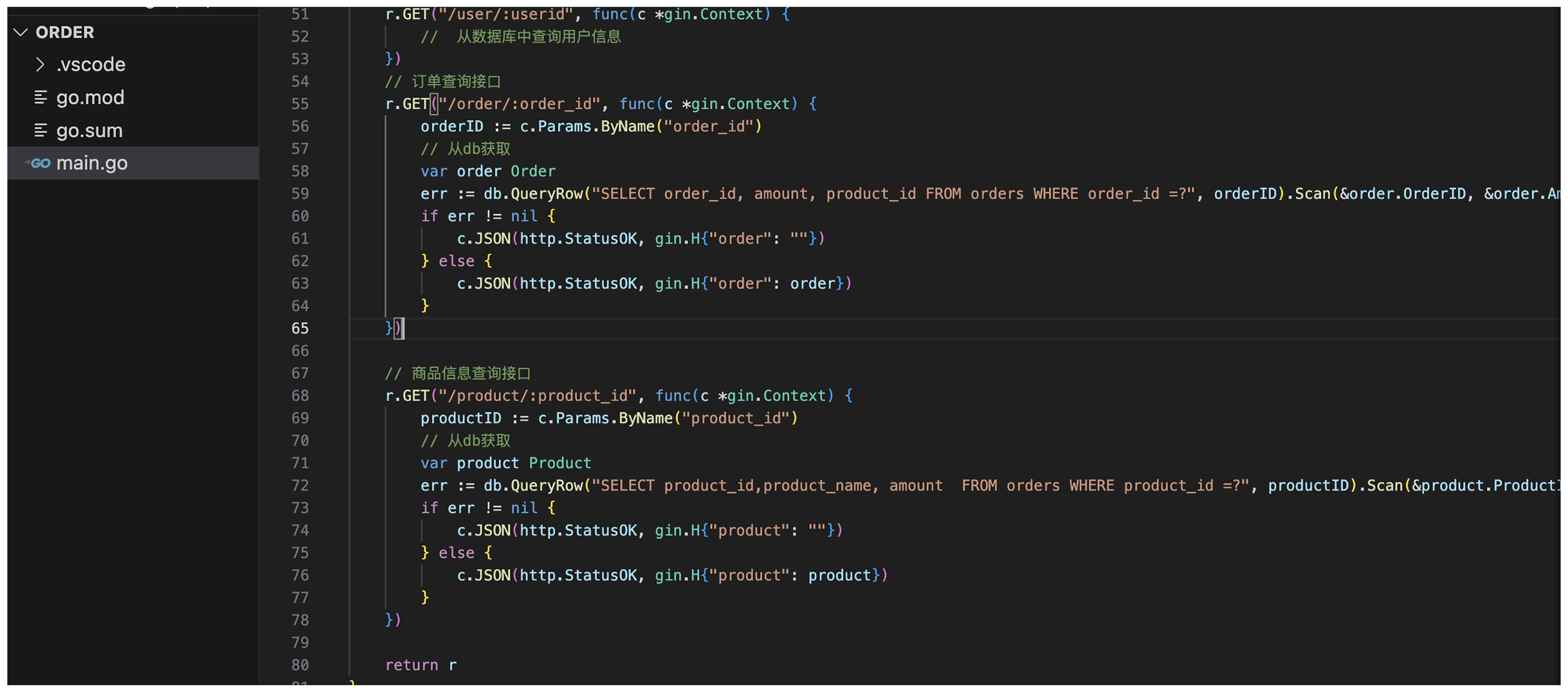 后面是order_handler.go文件中的获取订单逻辑,可以看到现在是从dal层获取订单信息和商品信息。