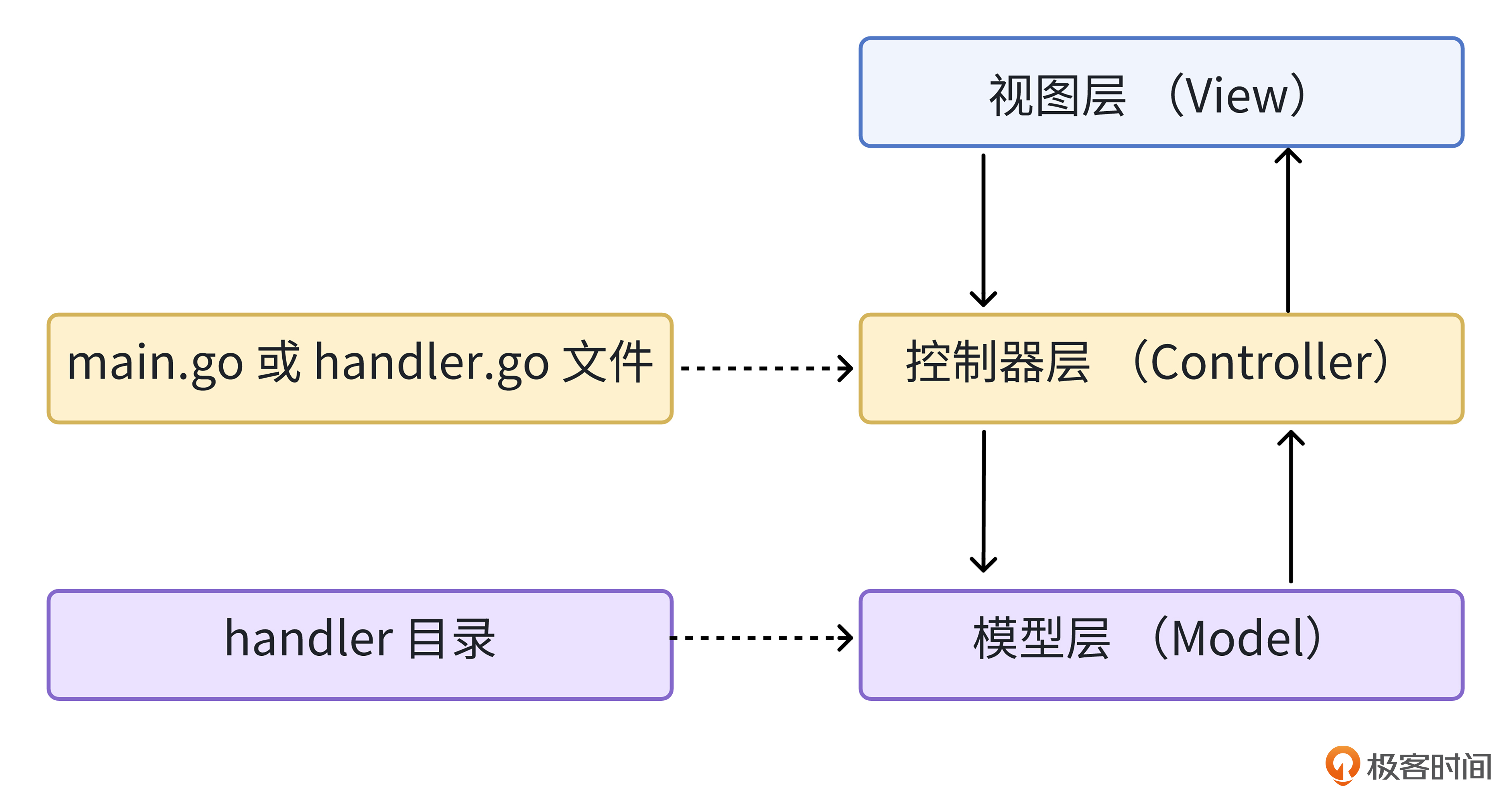 - **Model层。**用于具体的业务逻辑处理以及从db等外部存储读取数据。相当于我们这里的handler目录。