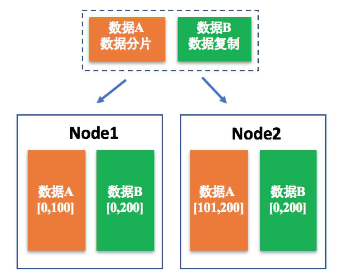 数据A被拆分为两部分存储在两个节点Node1和Node2上,属于数据分片;而对数据B来说,同一份完整的数据在两个节点中均有存储,就属于数据复制。