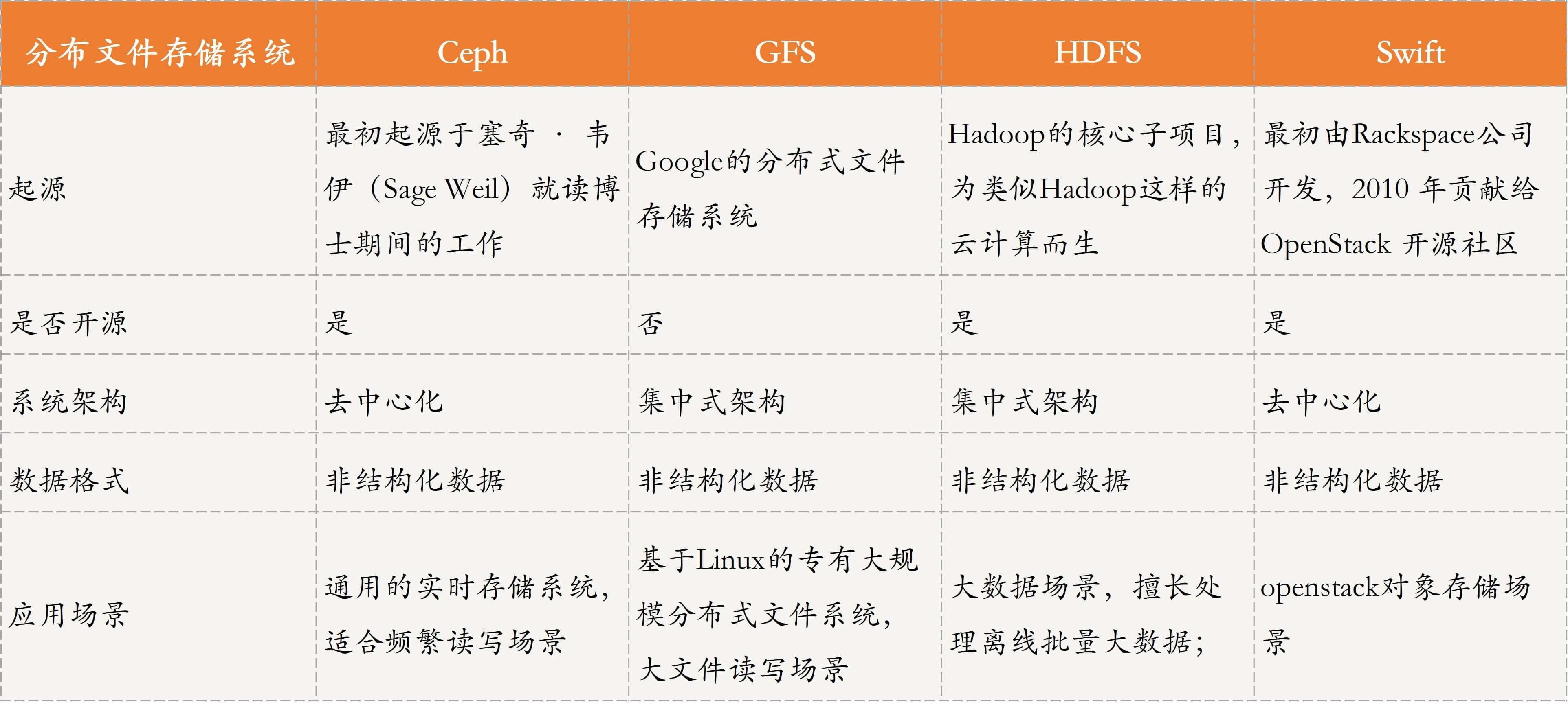 然后,我们看一下主流的分布式存储系统,主要包括Ceph、GFS、HDFS和Swift等,具体对比分析如下所示。