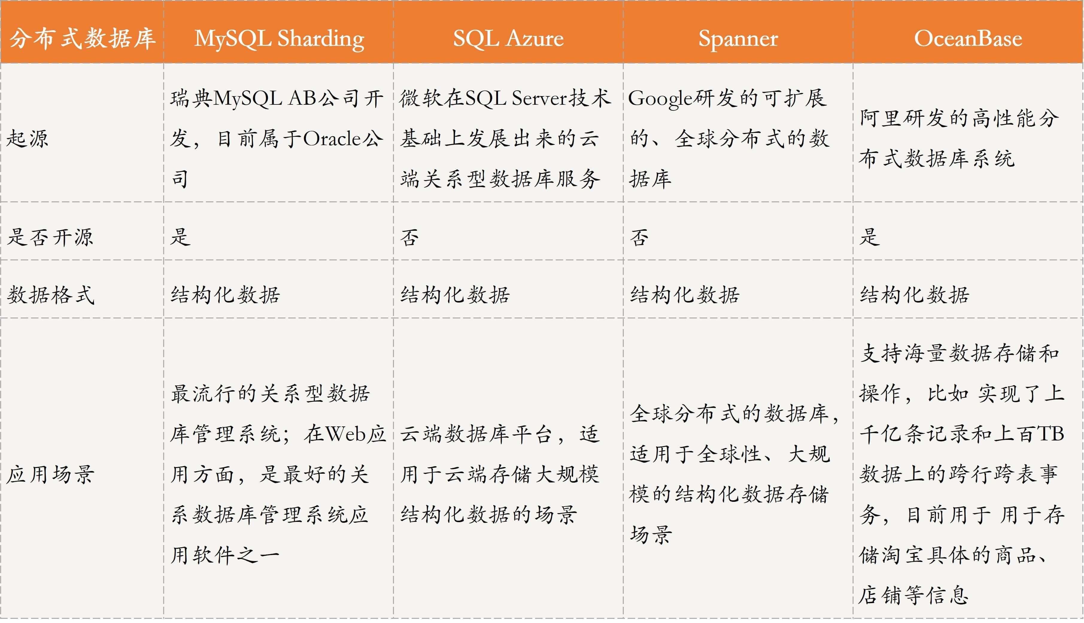 首先,我们看一下主流的分布式数据库,主要包括MySQL Sharding、SQL Azure、Spanner、OceanBase等,具体对比分析如下表所示。