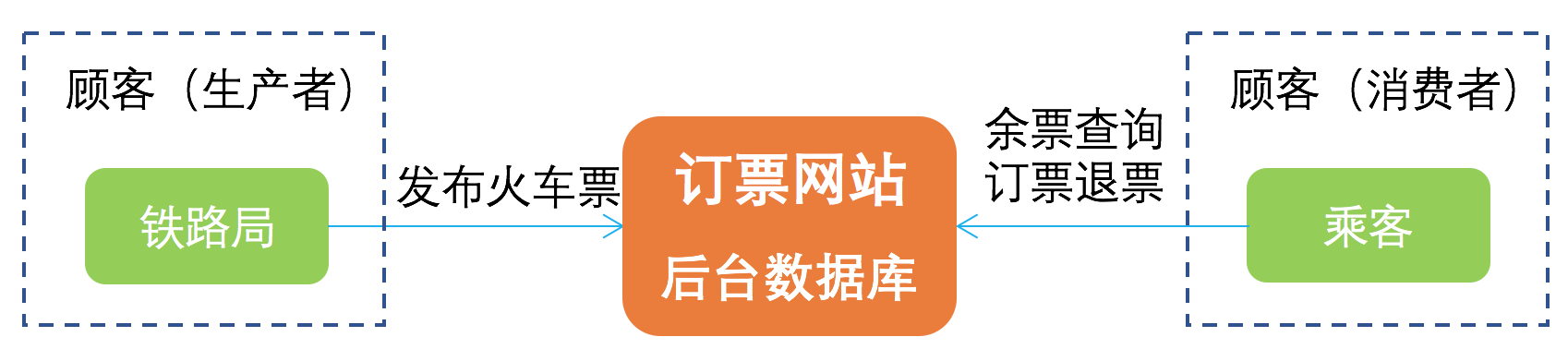 就像是火车票存储系统,如图所示,铁路局就相当于生产者类型的顾客,而乘客就相当于消费者类型的顾客。铁路局将各个线路的火车票信息发布到订票网站的后台数据库中,乘客通过订票网站访问数据库,来进行查询余票、订票、退票等操作。