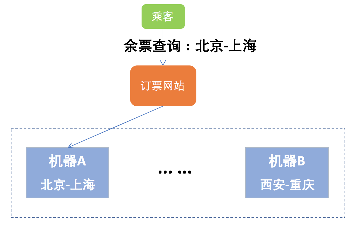 也就是说,当铁路局发布各个线路的火车票信息时,会按照一定规则存储到相应的机器中,比如北京到上海的火车票存储到机器A中,西安到重庆的火车票存储到机器B中。当乘客查询火车票时,系统就可以根据查询条件迅速定位到相对应的存储机器,然后将数据返回给用户,响应时间就大大缩短了。如图所示,当查询北京-上海的火车票相关信息时,可以与机器A进行数据交互。