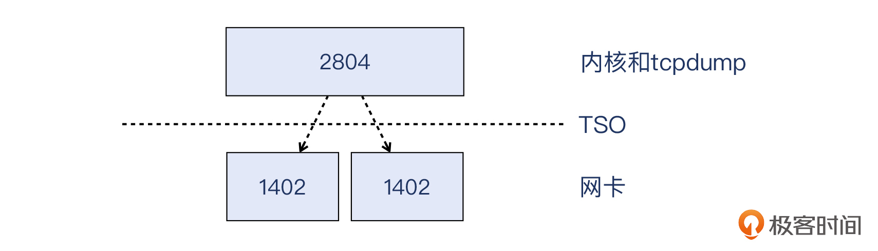 其实,你如果是连续学习课程过来的,应该会对TSO有印象。这是我们在[第8讲]提到的概念。有了TSO,操作系统就可以把大于MSS的TCP段,比如2个MSS或更大尺寸的段,交给网卡驱动来处理,后者会利用其硬件芯片做分段工作,重新组装成新的符合MTU的报文后发送出去。