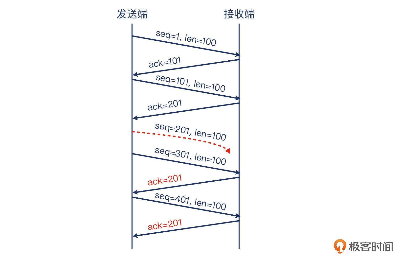 接收端回复的报文的确认号,只能是连续字节数的最后一个位置。因为发送端的序列号为201、长度为100的TCP报文丢失了,那么服务端收到的连续字节数的最后一个位置,就是第201字节。这还不是最糟糕的,后续发送过来的序列号为301和401这两个报文,服务端回复的确认报文的确认号也仍然只能是201。