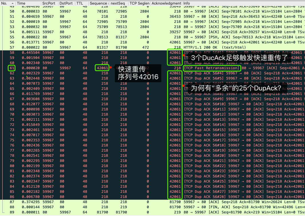 61号快速重传报文的原始报文是哪个呢?不难找到,它就是32号报文,因为它的序列号就是42061,也就是连续DupAck的确认号。