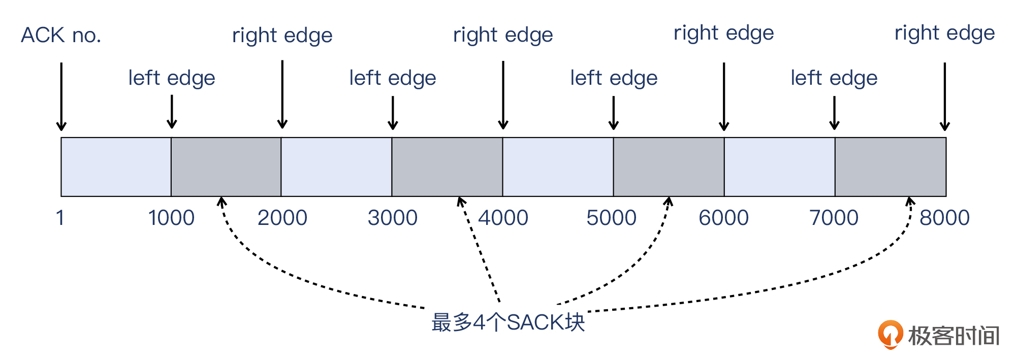 那么有了SACK,是不是所有的这种零星到达的报文,都不用重传了呢?答案是没有那么乐观。受限于TCP Option长度,SACK部分最多只能容纳4个块。当然,这比没有SACK的情况还是好多了。