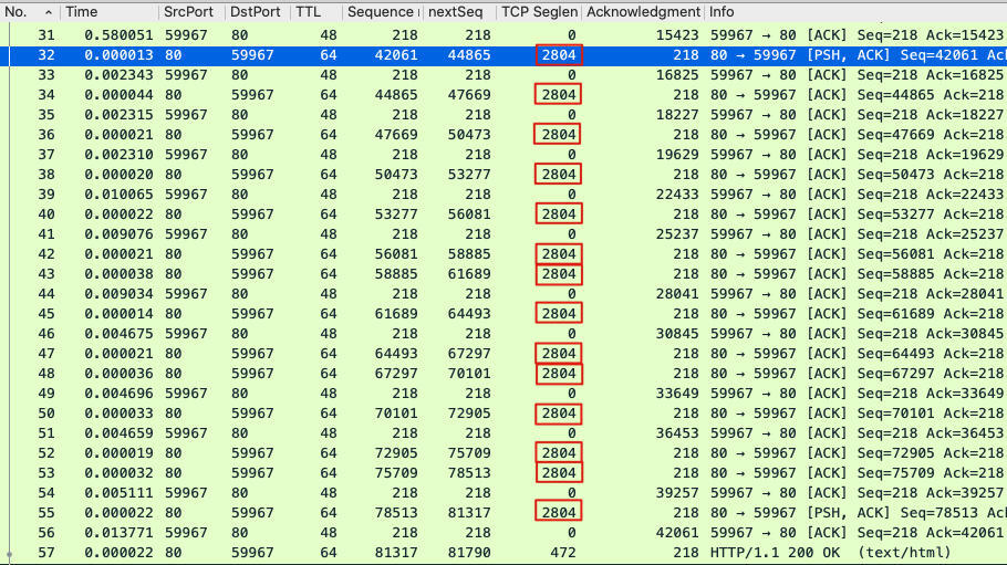 这14个报文,每个都是2804字节大小,这就显然是TSO在起作用了。服务端把2804字节发给网卡后,网卡拆分为2个报文后发出,所以14个数据报文,实际到达接收端的时候就是28个报文!