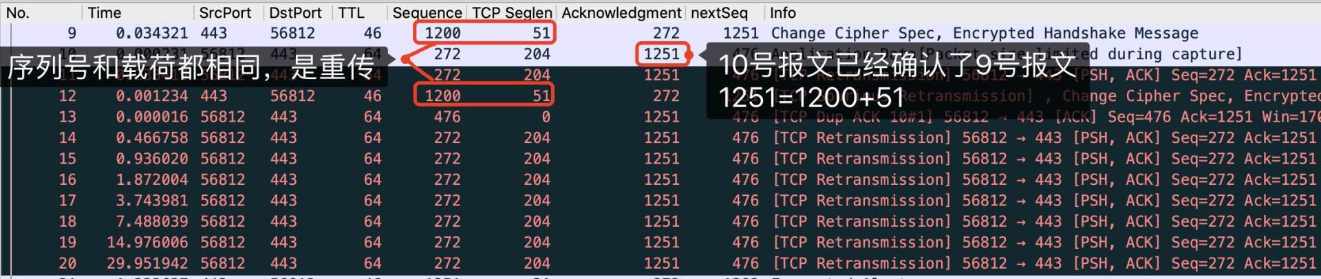不过我们仔细观察报文,还是发现了一些问题。10号报文的确认号是1251,也就是9号报文的下个序列号(1251=序列号1200+载荷长度51),所以10号报文就是客户端对9号的确认报文。那么,9号既然已经被确认了,为什么还要12号报文这个重传呢?