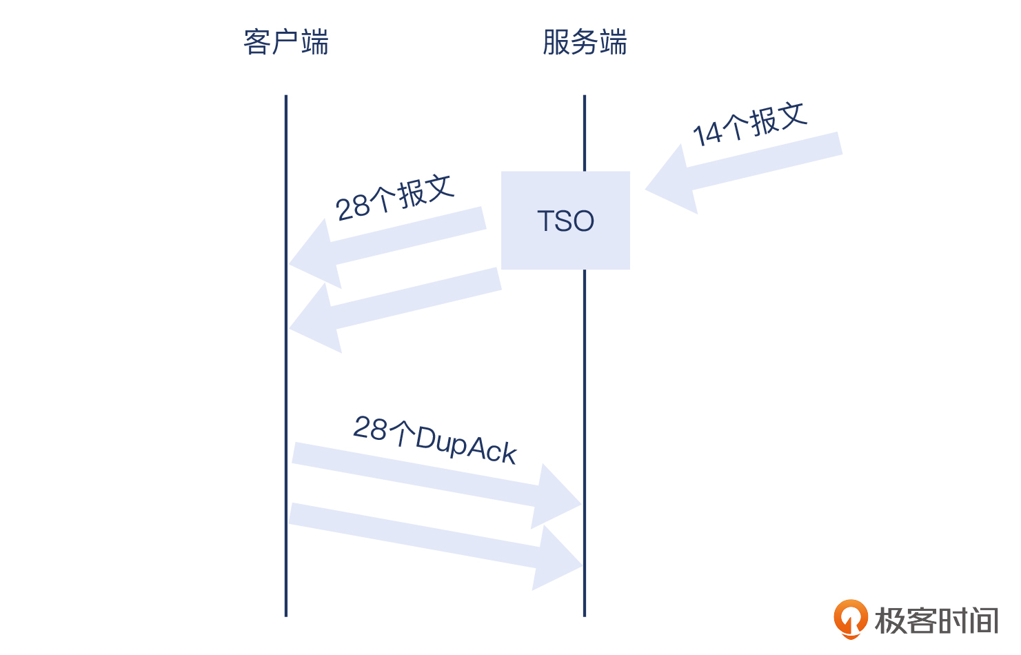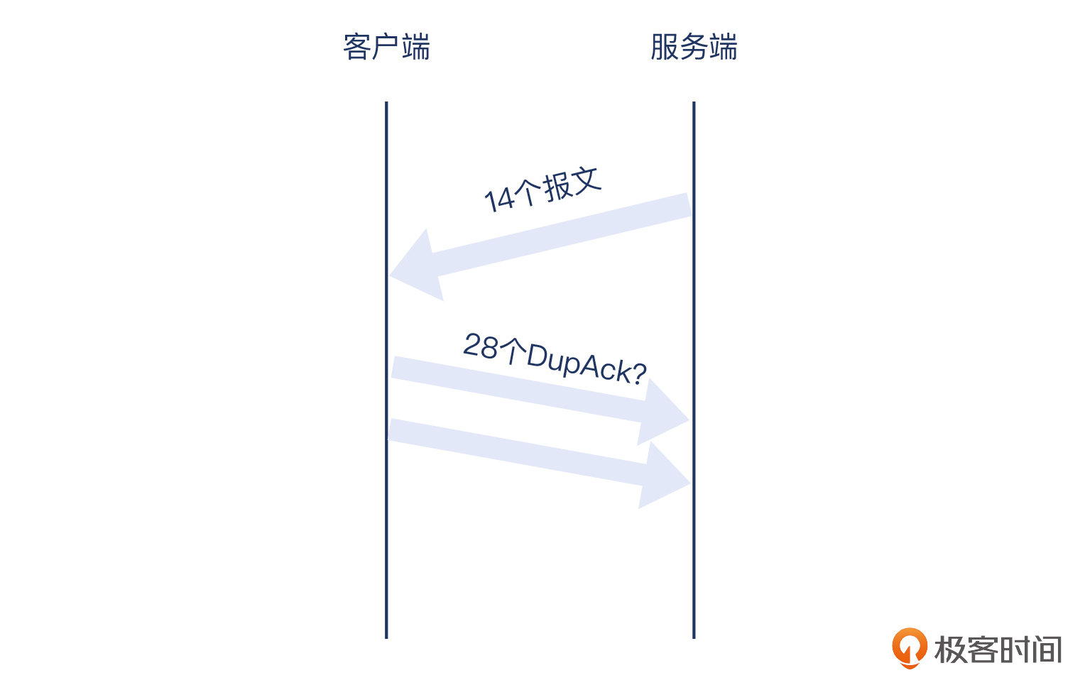 我直接给你揭晓答案:就是因为从32号报文之后,服务端还继续发送了14个数据报文,远不止3个,所以触发的DupAck也远不止是3个。你可以直接看下图来理解这里的逻辑: