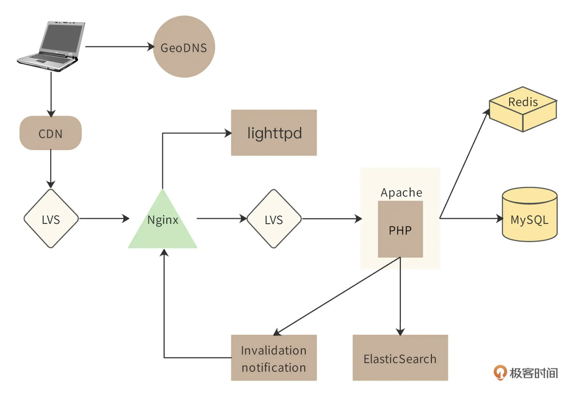 准确地说,CDN访问的是Wepedia数据中心负载均衡服务器LVS的IP地址。请求到达LVS后,LVS会将该请求分发到某个Nginx服务器上。Nginx收到请求后,也查找自己服务器上是否有对应的词条内容,如果没有,就将请求发送给第二级LVS负载均衡服务器。