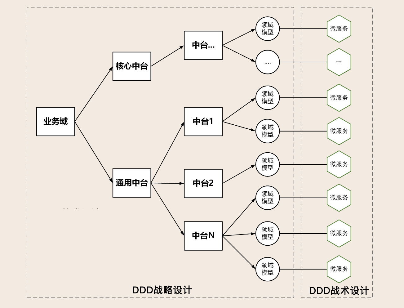 中台在企业架构上更多偏向业务模型,形成中台的过程实际上也是业务领域不断细分的过程。在这个过程中我们会将同类通用的业务能力进行聚合和业务重构,再根据限界上下文和业务内聚的原则建立领域模型。而DDD的战略设计最擅长的就是领域建模。