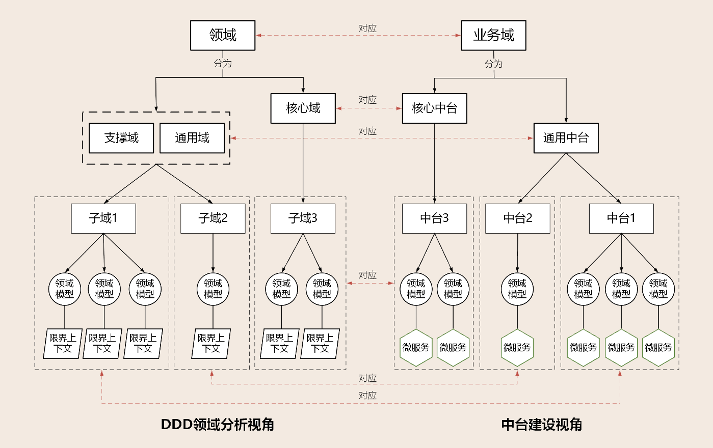 从领域功能属性和重要性对照来看,通用中台对应DDD的通用域和支撑域,核心中台对应DDD的核心域。从领域的功能范围来看,子域与中台是一致的。领域模型所在的限界上下文对应微服务。建立了这个映射关系,我们就可以用DDD来进行中台业务建模了。