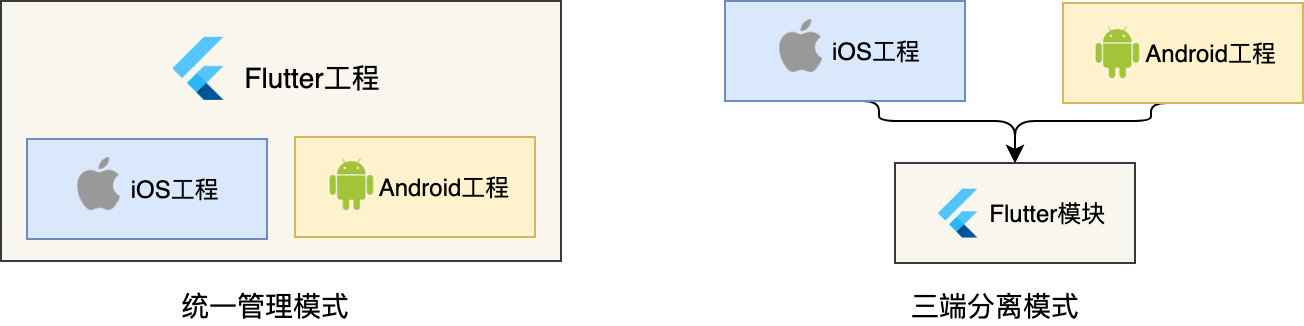 原生工程混编Flutter的方式有两种。一种是,将Flutter工程内嵌Android和iOS工程,由Flutter统一管理的集中模式;另一种是,将Flutter工程作为原生工程共用的子模块,由原生工程各自管理的三端工程分离模式。目前,业界采用的基本都是第二种方式。