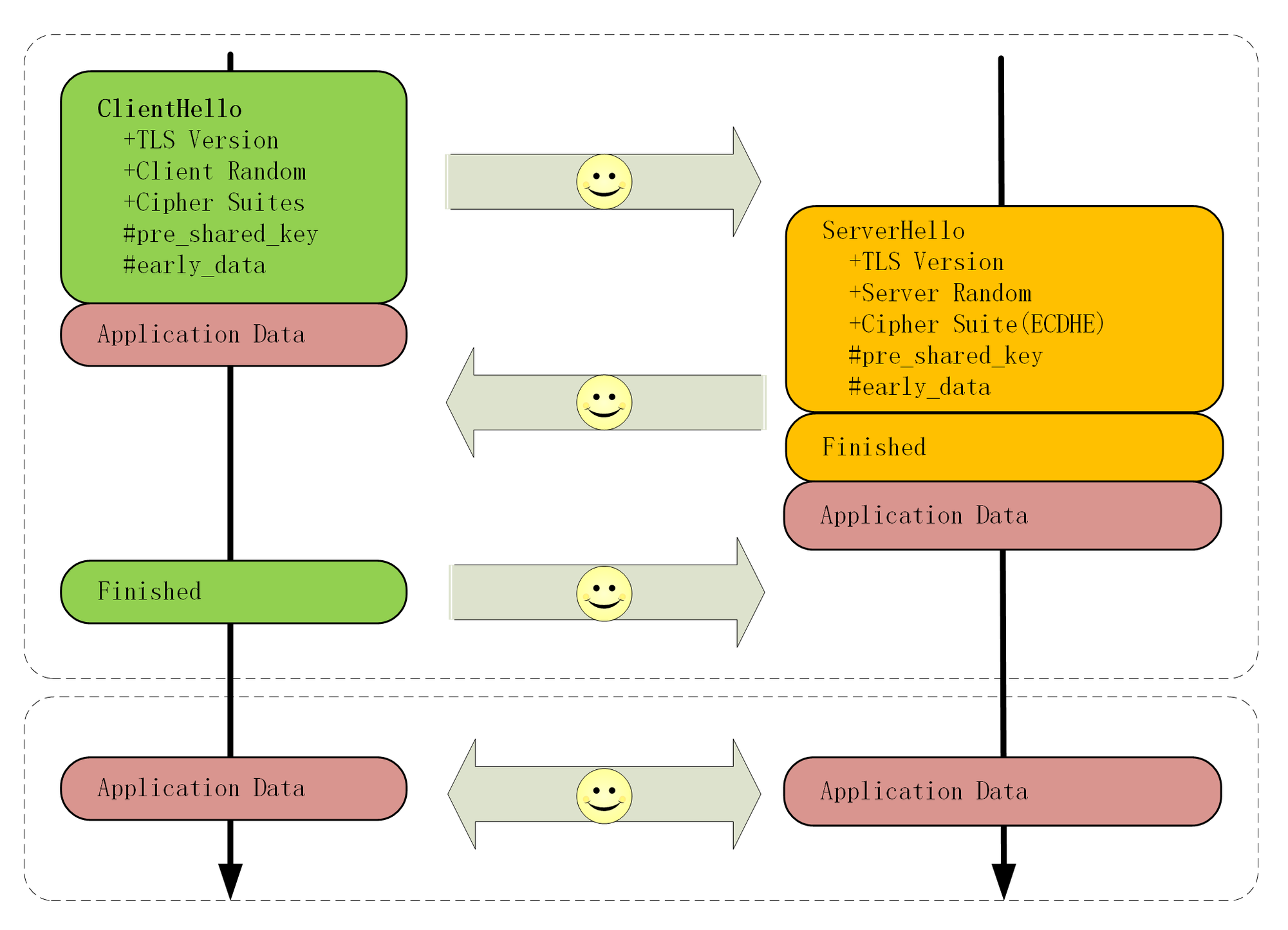 “False Start”“Session ID”“Session Ticket”等方式只能实现1-RTT,而TLS1.3更进一步实现了“0-RTT”,原理和“Session Ticket”差不多,但在发送Ticket的同时会带上应用数据(Early Data),免去了1.2里的服务器确认步骤,这种方式叫“Pre-shared Key”,简称为“PSK”。