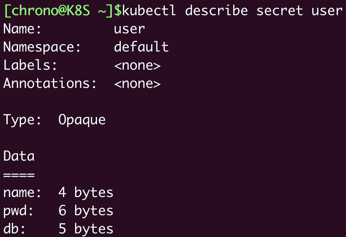 这样一个存储敏感信息的Secret对象也就创建好了,而且因为它是保密的,使用 kubectl describe 不能直接看到内容,只能看到数据的大小,你可以和ConfigMap对比一下。