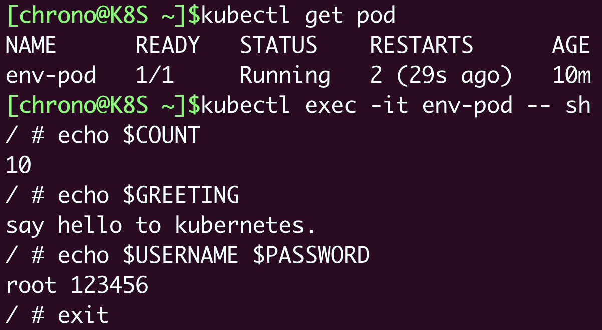 弄清楚了环境变量的注入方式之后,让我们用 kubectl apply 创建Pod,再用 kubectl exec 进入Pod,验证环境变量是否生效:
