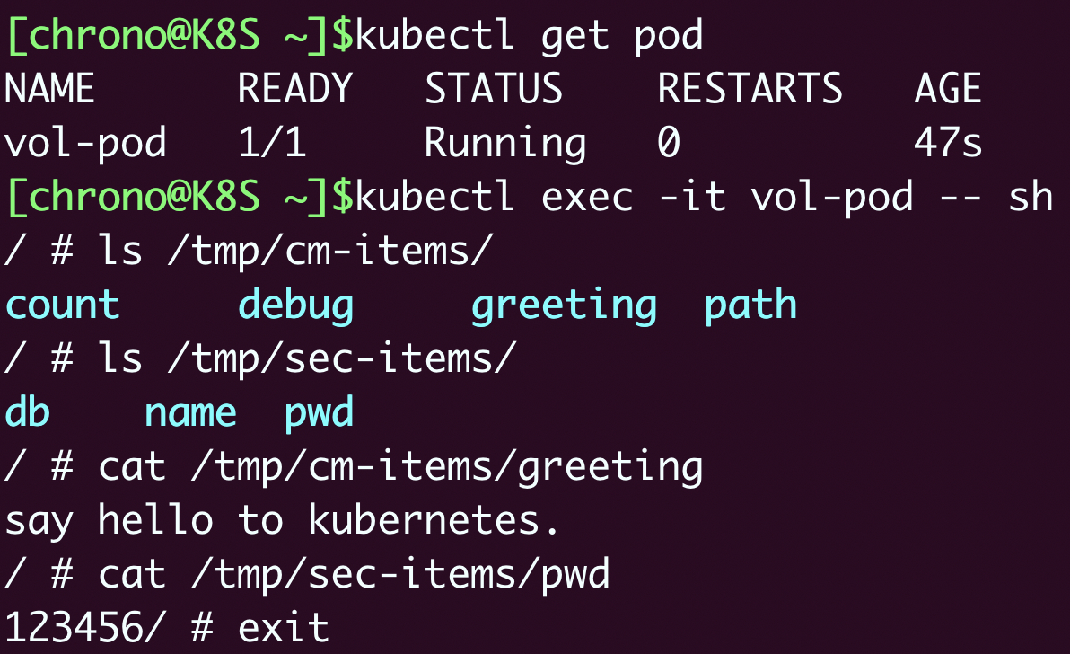 创建之后,我们还是用 kubectl exec 进入Pod,看看配置信息被加载成了什么形式: