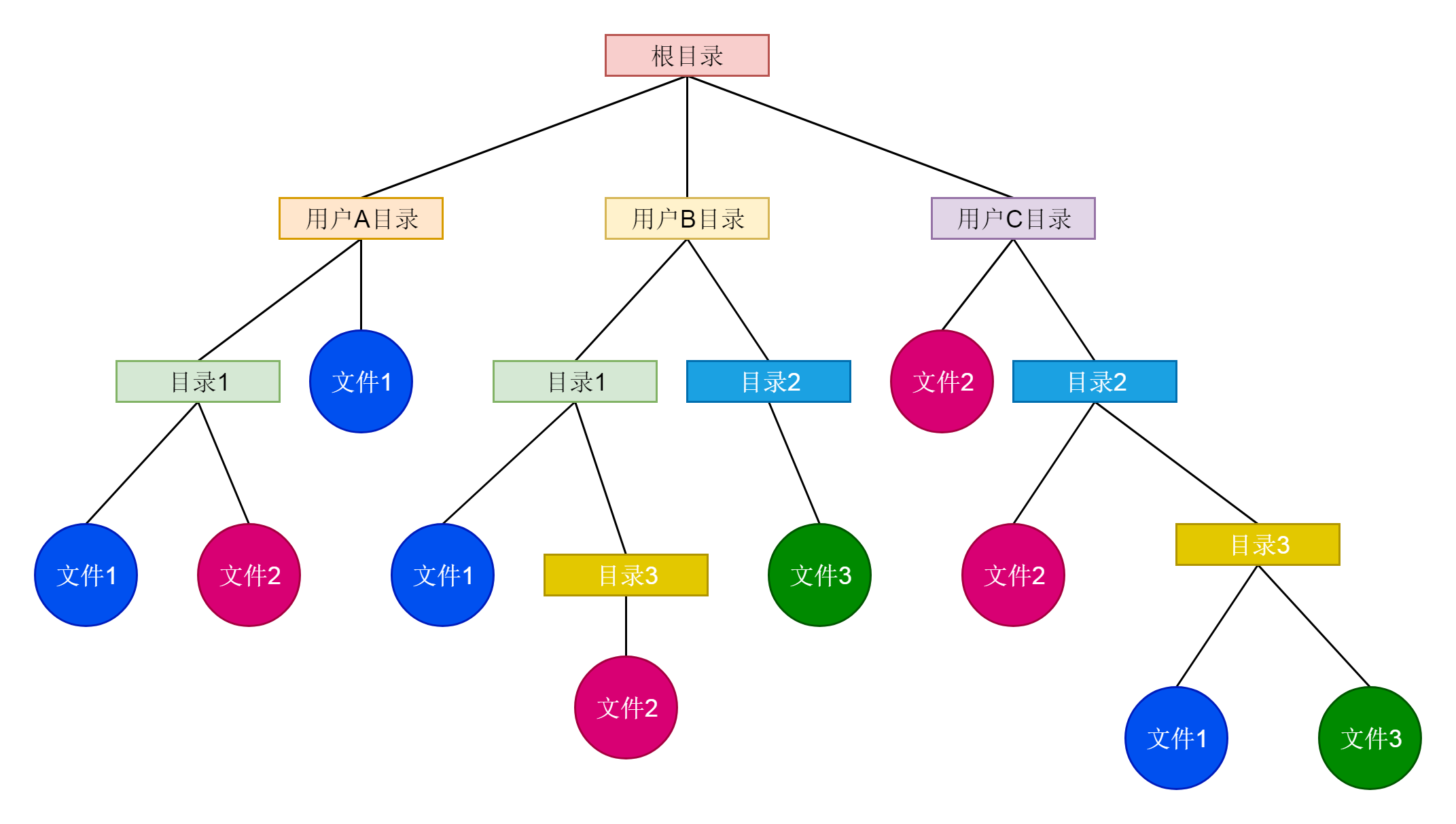 要想把很多的文件有序地组织起来,我们就需要把它们成为目录或者文件夹。这样,一个文件夹里可以包含文件夹,也可以包含文件,这样就形成了一种树形结构。而我们可以将不同的用户放在不同的用户目录下,就可以一定程度上避免了命名的冲突问题。
