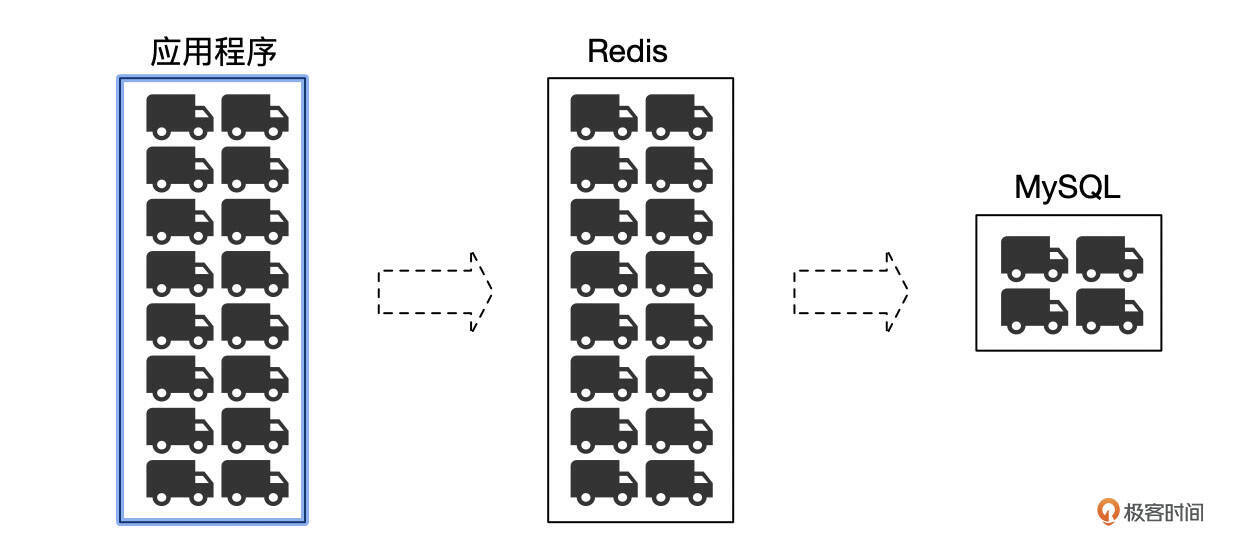 下面这个图可以更好地解释这个现象。应用程序发起的请求,先在Redis中积压了十几秒,然后又几乎在同一个时间点从Redis请求中返回,一瞬间,这些请求同时涌向了MySQL,MySQL不堪重负,发生了故障。