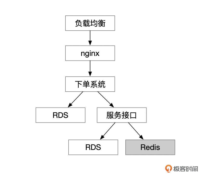 我们跟客户侧的架构师一起,梳理了业务系统的部署结构和调用链路。下面这个架构图中,位于最上层的是负载均衡设备,会把来自用户的请求分发到nginx,nginx再把请求转到后端应用,后端应用还会通过Web Service调用一些服务接口,位于架构最底层的是RDS和Redis。这也是比较典型的一种Web应用部署架构。