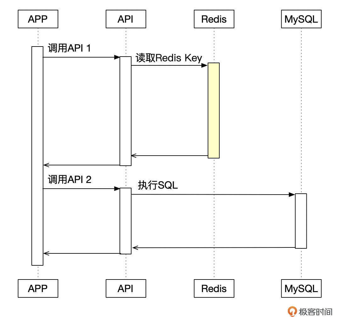 看来对Redis的操作才是引起故障的真正原因。为了更好地理解这个问题,我画了一个程序访问的时序图。用户扫码付款时,应用程序请求某个API,读取Redis中的一个Key,但由于当时Redis在执行 keys * 命令,读取Key的请求就被阻塞了。