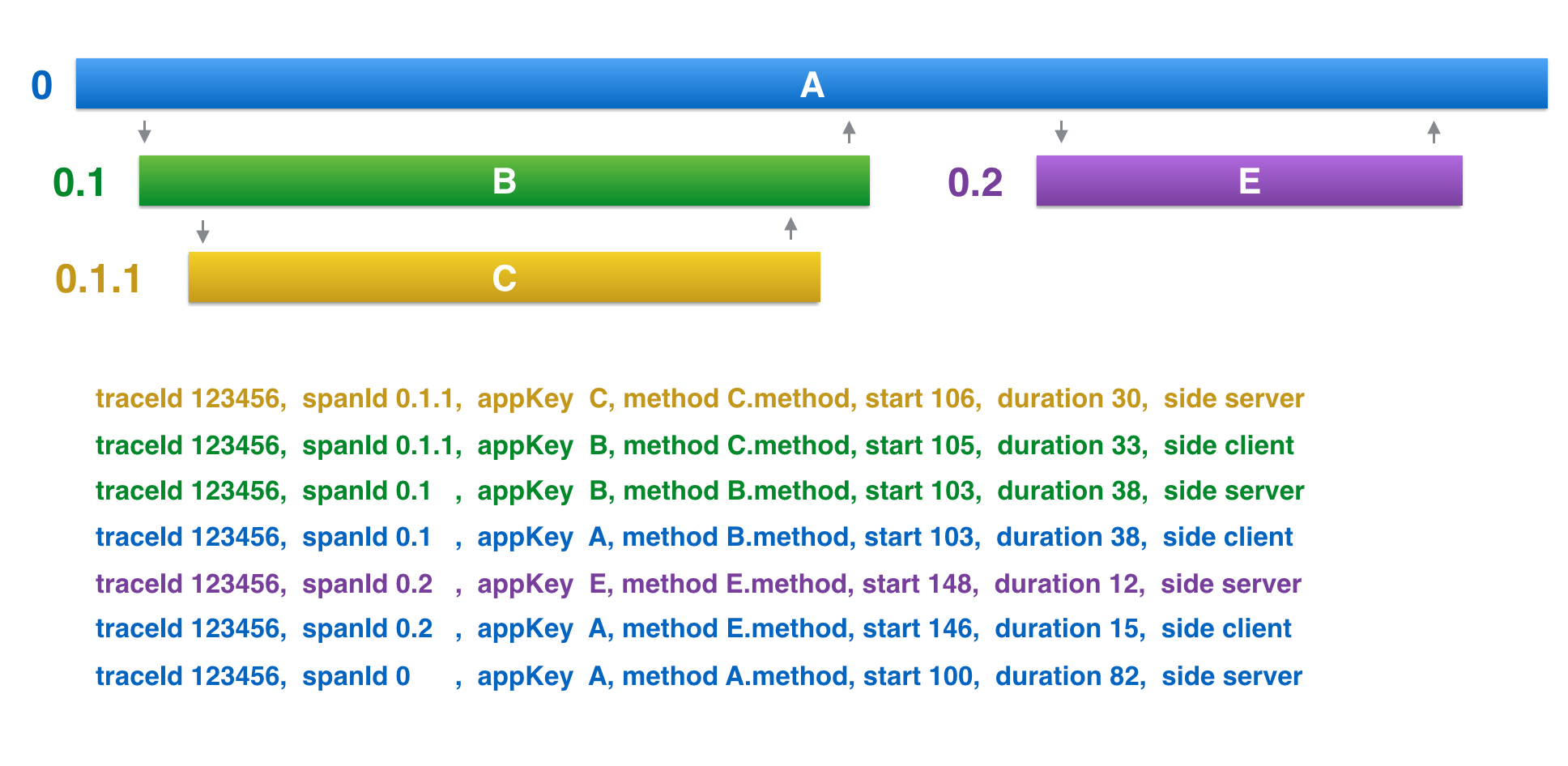 首先看下面这张图,我来给你讲解下服务追踪系统中几个最基本概念。