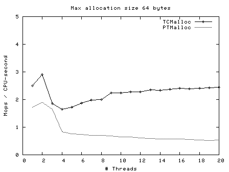 下图是TCMalloc作者给出的性能测试数据,可以看到线程数越多,二者的速度差距越大。所以,当应用场景涉及大量的并发线程时,换成TCMalloc库也更有优势!