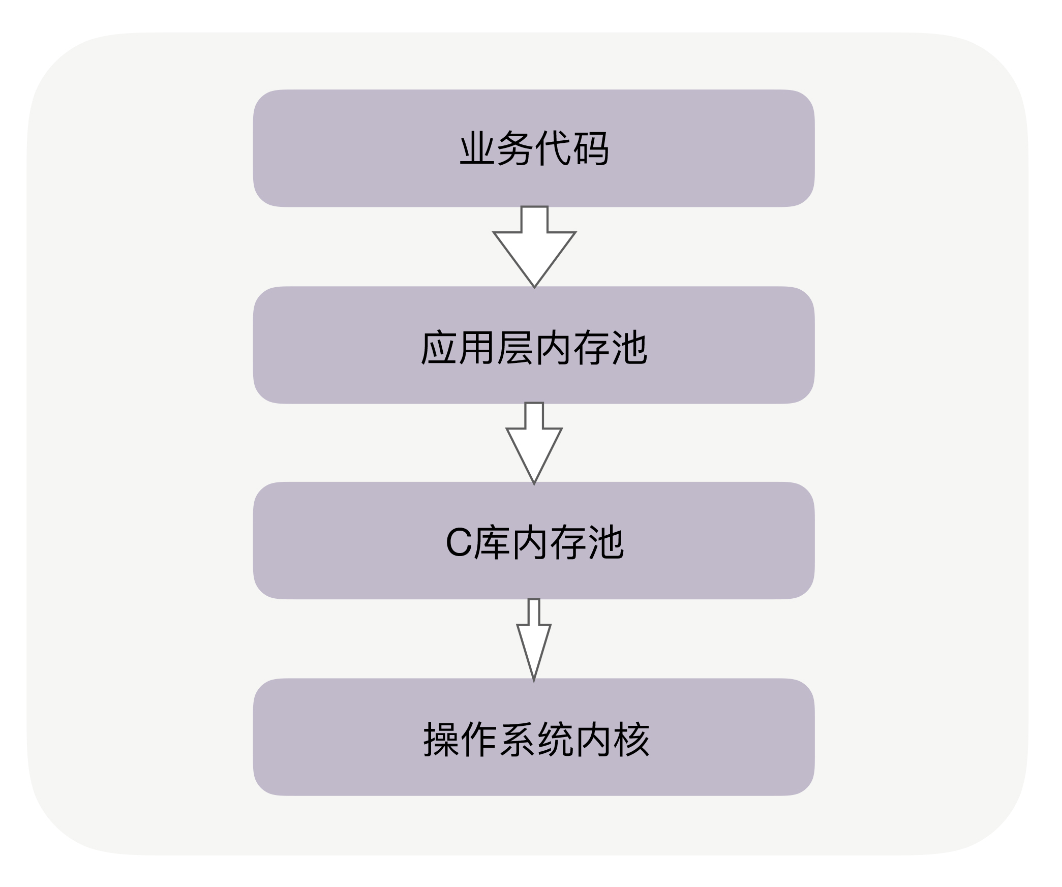 你可能听说过Google的TCMalloc和FaceBook的JEMalloc,它们也是C库内存池。当C库内存池无法满足内存申请时,才会向操作系统内核申请分配内存。如下图所示: