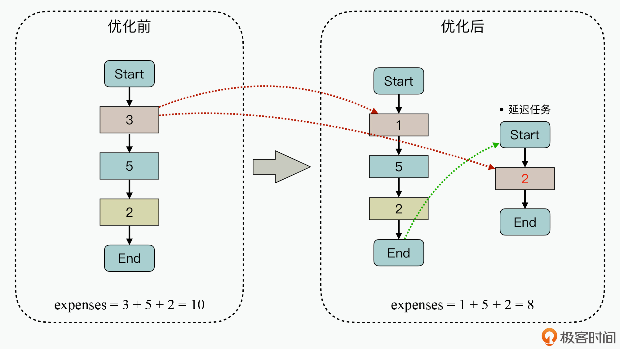 在上图的左侧部分,可以看到第一个矩形代码块的执行开销为3,而我们通过分析业务流程和度量数据,发现这个功能的优先级比较低。因此可以使用的优化策略就是:把优先级比较低的代码块放到业务最后,在极端场景下,也可以通过直接丢弃不处理来保证系统性能不恶化。