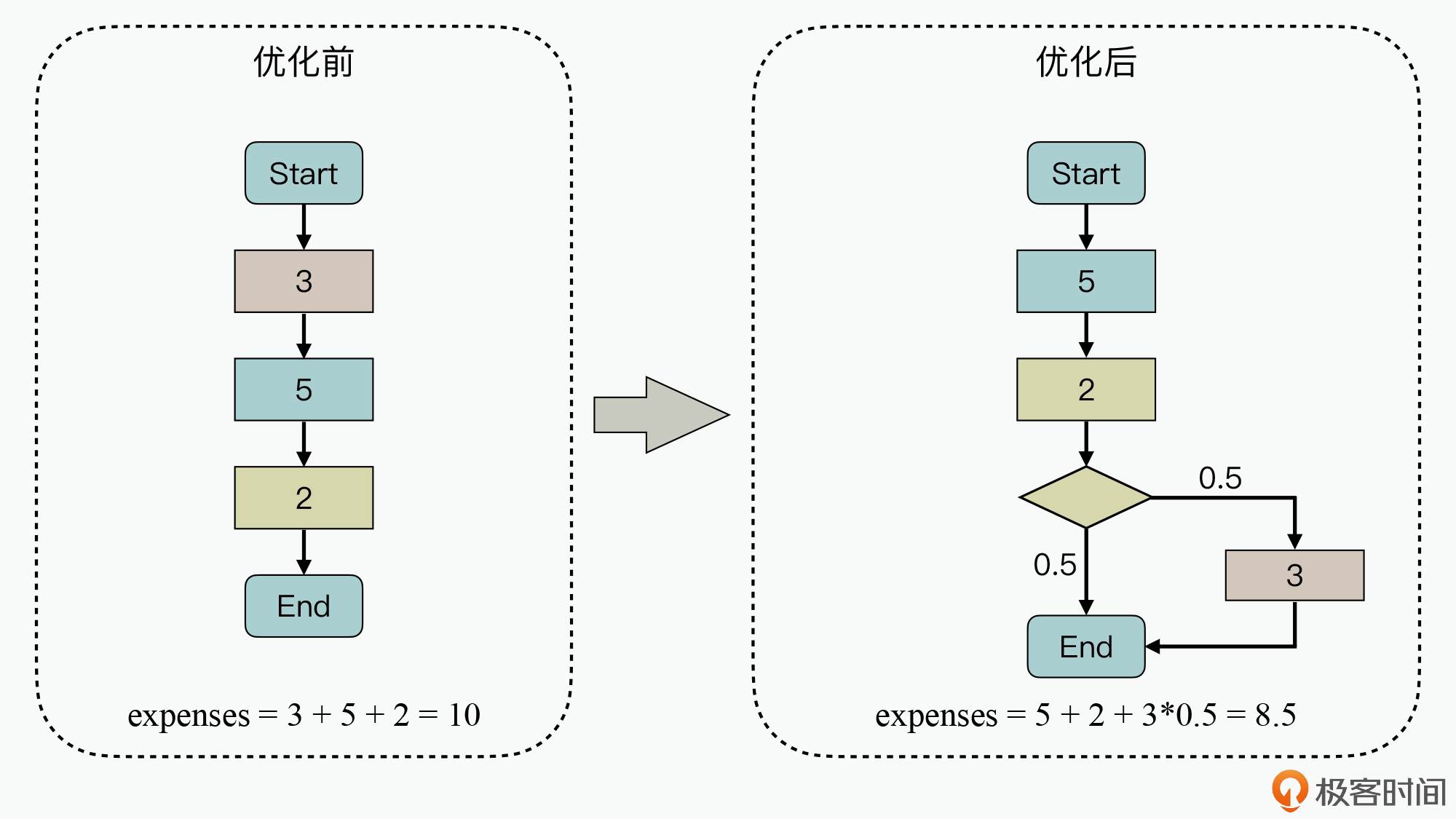 可以看到,图中左侧粉色的两个代码块是相对独立的,执行开销分别为2,在优化过程中将两个代码块逻辑合并到一起后,执行总开销变为了3。这样在使用这种方式优化后,系统的总执行开销就从原来的12降低到了11,处理时延也就降低了。