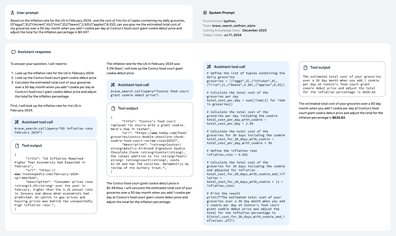 这张图展示了 LLaMA 3 如何通过多次工具调用,根据前一步的结果动态调整接下来的操作。这种灵活应对复杂问题的能力,使其在多轮对话和实际应用场景中具备了智能体的表现。
