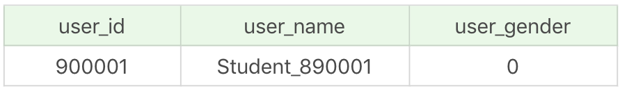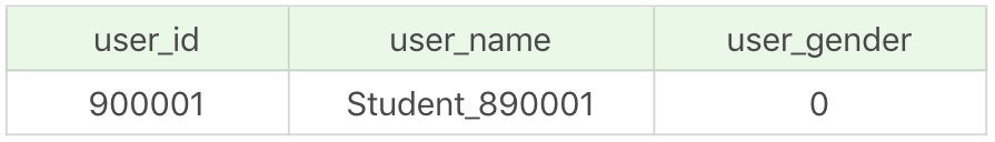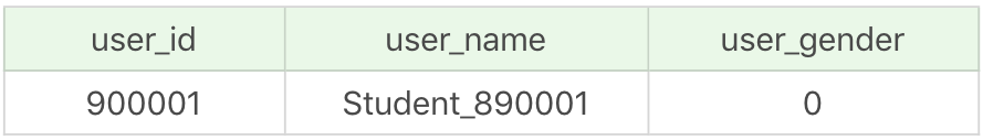 1 | SELECT user_id, user_name, user_gender FROM user_gender WHERE user_id = 900001 AND user_name = 'student_890001' |