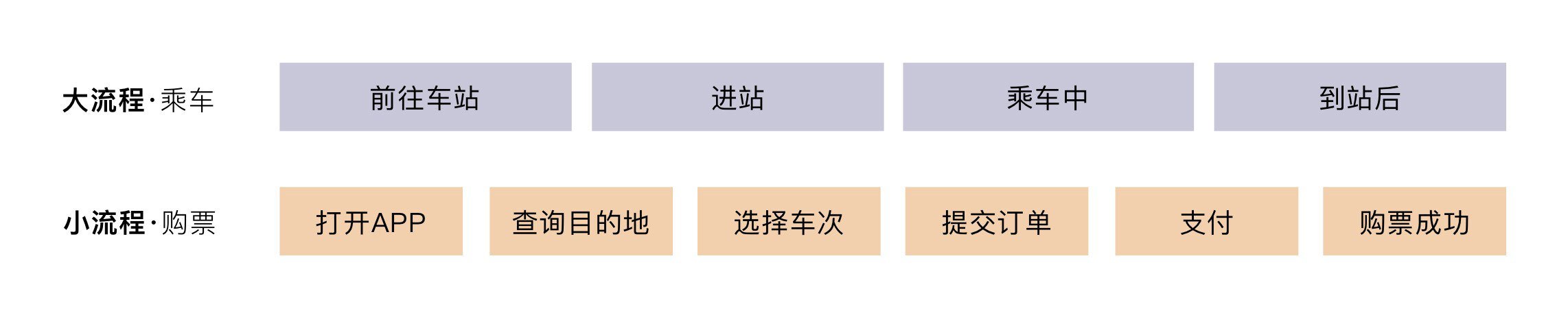 接下来,我以乘坐高铁这件事为例。整个乘车的流程大致会分为:乘车前、乘车中、乘车后几个主要的大环节。我们再细致分一下,每个大环节里面还可以再细分成一些小环节。