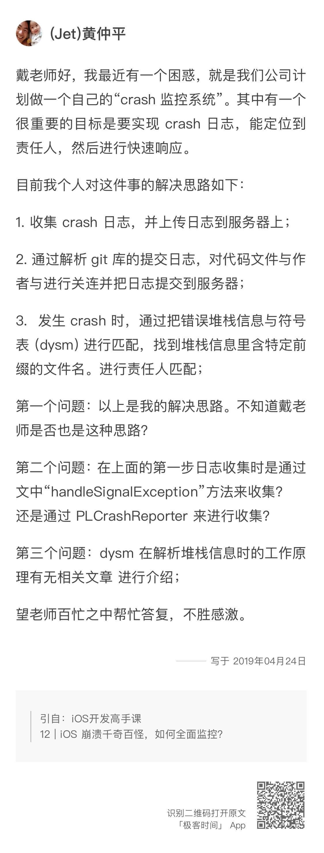 在专栏的第12篇文章[《iOS 崩溃千奇百怪,如何全面监控?》]后,(Jet)黄仲平同学提了这么几个问题。考虑到这几个问题涉及知识点比较有代表性,所以我特意在今天这篇答疑文章中和你详细展开下。