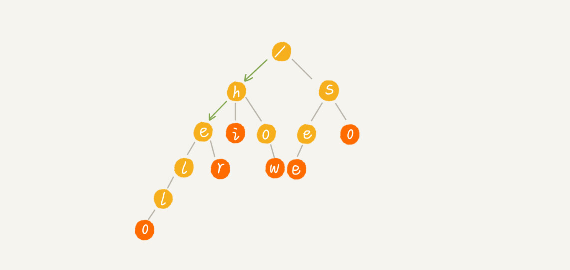 如果我们要查找的是字符串“he”呢?我们还用上面同样的方法,从根节点开始,沿着某条路径来匹配,如图所示,绿色的路径,是字符串“he”匹配的路径。但是,路径的最后一个节点“e”并不是红色的。也就是说,“he”是某个字符串的前缀子串,但并不能完全匹配任何字符串。