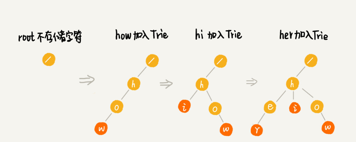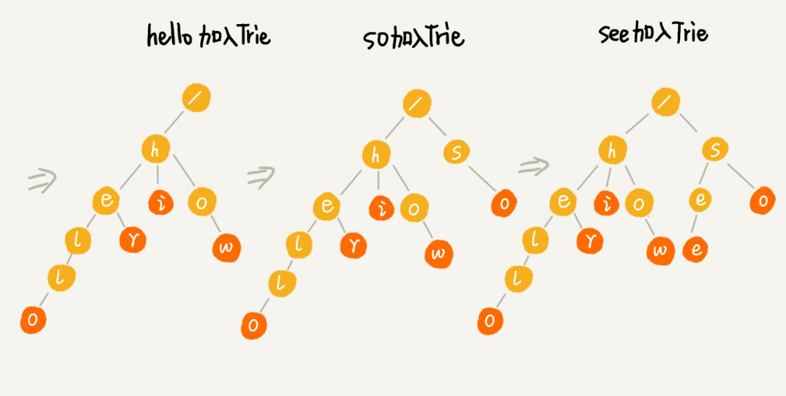 为了让你更容易理解Trie树是怎么构造出来的,我画了一个Trie树构造的分解过程。构造过程的每一步,都相当于往Trie树中插入一个字符串。当所有字符串都插入完成之后,Trie树就构造好了。