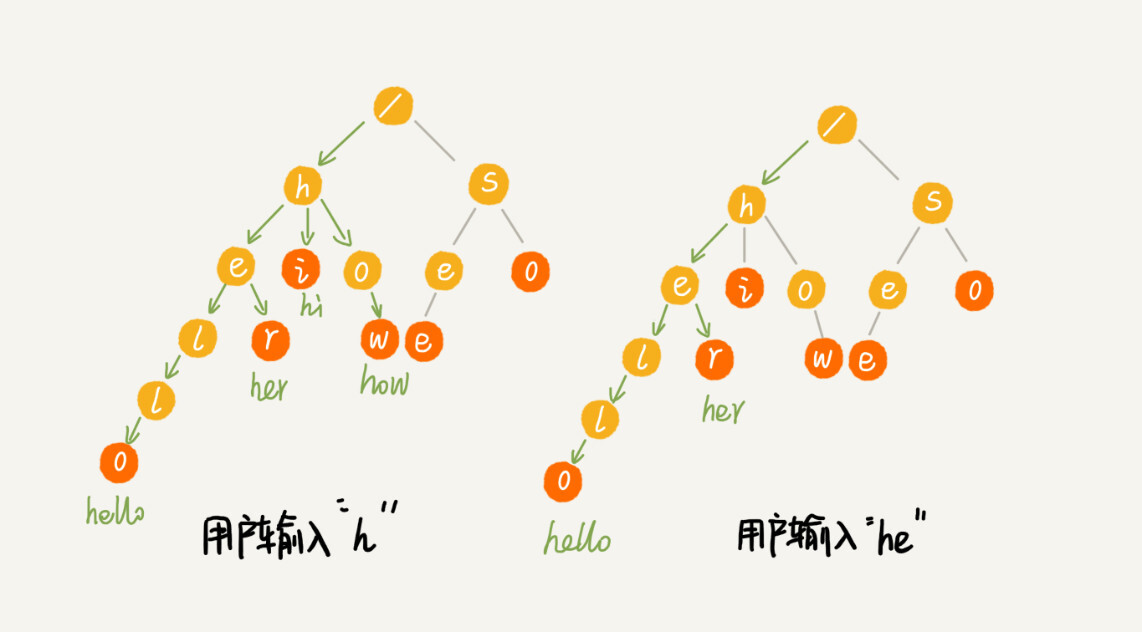 我们假设关键词库由用户的热门搜索关键词组成。我们将这个词库构建成一个Trie树。当用户输入其中某个单词的时候,把这个词作为一个前缀子串在Trie树中匹配。为了讲解方便,我们假设词库里只有hello、her、hi、how、so、see这6个关键词。当用户输入了字母h的时候,我们就把以h为前缀的hello、her、hi、how展示在搜索提示框内。当用户继续键入字母e的时候,我们就把以he为前缀的hello、her展示在搜索提示框内。这就是搜索关键词提示的最基本的算法原理。