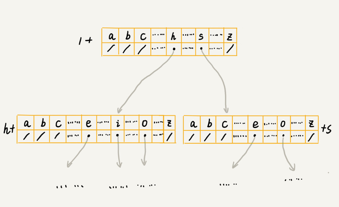 我们前面讲过,Trie树的本质是避免重复存储一组字符串的相同前缀子串,但是现在每个字符(对应一个节点)的存储远远大于1个字节。按照我们上面举的例子,数组长度为26,每个元素是8字节,那每个节点就会额外需要26*8=208个字节。而且这还是只包含26个字符的情况。