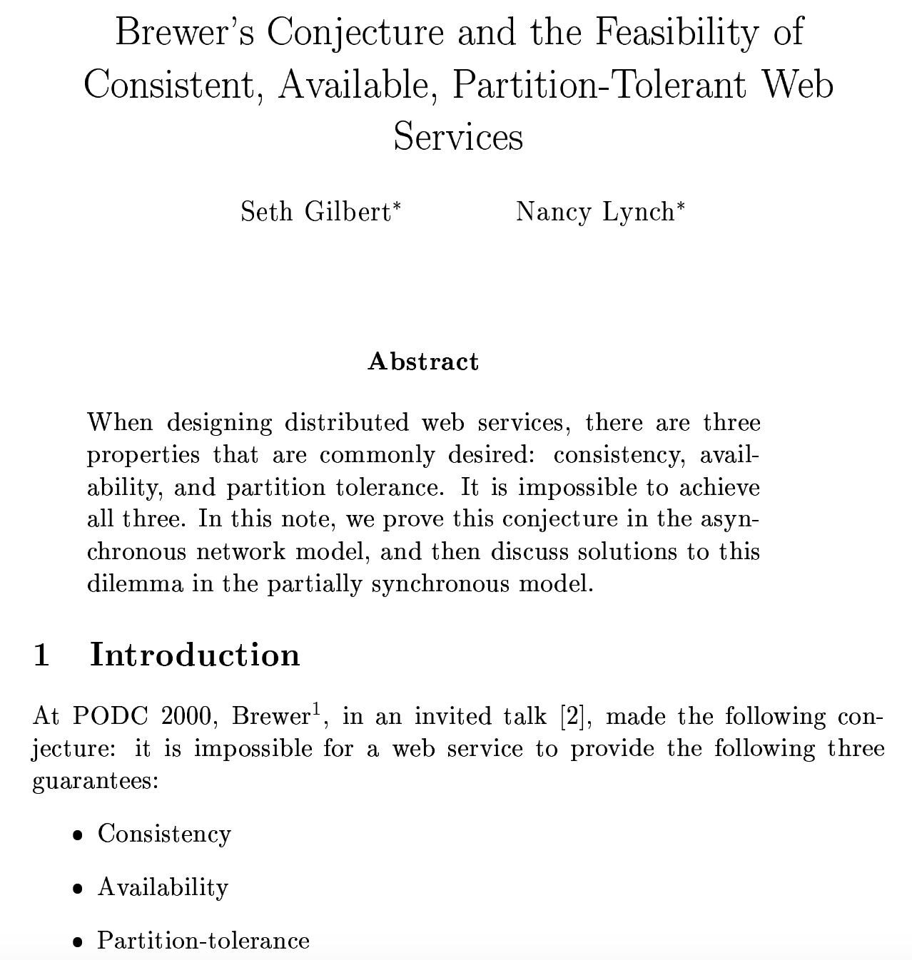 在两年之后,塞思·吉尔伯特(Seth Gilbert)和麻省理工学院的南希·林奇教授(Nancy Ann Lynch)在他们的论文“Brewer’s conjecture and the Feasibility of Consistent, Available, Partition-Tolerant Web Services”中证明了这一概念。